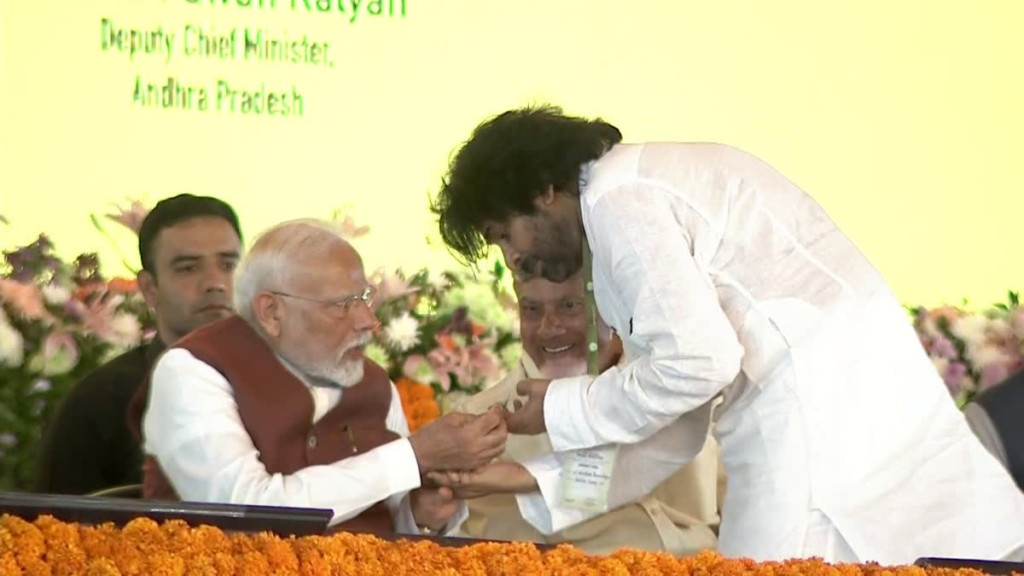 డిప్యూటీ సీఎం పవన్ కల్యాణ్కి ప్రధాని మోదీ చాక్లెట్ ఇచ్చారు. పవన్ ప్రసగించిన తర్వాత ఆయన కుర్చీలో కూర్చున్నారు. ఈ క్రమంలోనే మోదీ ఆయణ్ని దగ్గరకి పిలిపించుకొని చాక్లెట్ అందజేసి అభినందించారు. ఇది చూసి పక్కనే ఉన్న వారు ముసిముసిగా నవ్వుకున్నారు. ఇప్పుడు ఈ వీడియో కాస్తా సోషల్ మీడియాలో వైరల్గా మారింది.